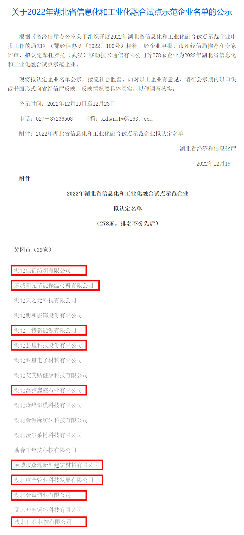 日前,省经信厅公布了2022年湖北省信息化和工业化融合试点示范企业评审结果,我市9家企业入选,2017年以来,获评企业总数达18家。此次入选的企业包括:湖北一特新能源有限公司、湖北佳锦纺织有限公司、湖北荟煌科技股份有限公司、麻城市众磊新型建筑材料有限公司、湖北磊雅鑫盛石业有限公司、麻城阳光节能保温材料有限公司、湖北屯仓管业科技发展有限公司、湖北金盘酒业有限公司、湖北仁誉科技有限公司。