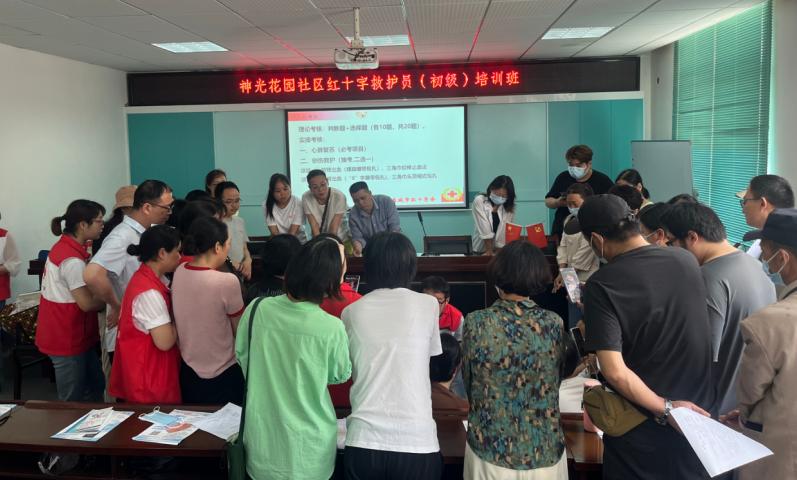 在培训活动中,红十字救护师资向社区居民讲解了常见意外伤害案例、徒手心肺复苏、海姆立克急救法等急救方法,并进行了现场演示。神光花园社区45名居民参加了救护员培训,通过理论和一对一实操考核合格,取得全国统一编号的《红十字救护员证》(初级)。