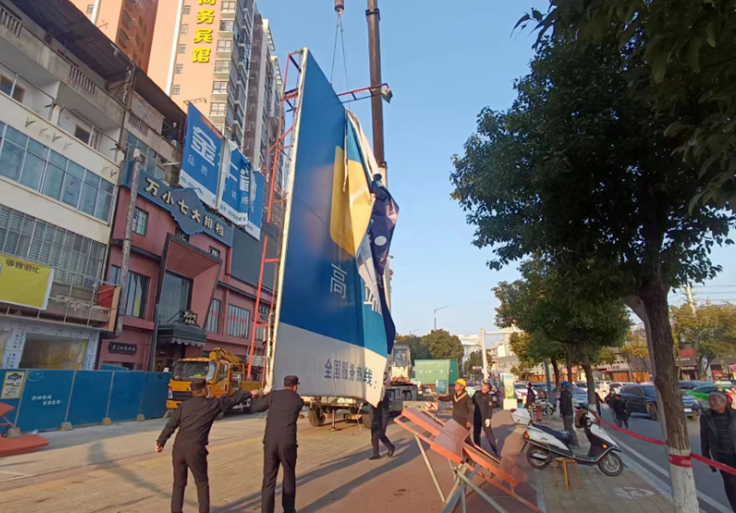 文化小镇对面楼顶大型户外广告牌拆除难度大,为保障拆除工作顺利进行,市户外广告设置管理服务中心精心制定行动方案。拆除前,执法人员多次与广告牌业主细致深入沟通,获得对方同意后,立即成立拆除专班。拆除当天,该局负责人现场督办高空广告牌拆除工作。经过两天加班加点的作业,6块大型楼顶广告牌全部拆除,面积约1000余平方米。拆除后,执法人员清理现场杂物,排除安全隐患。