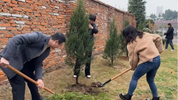 3月12日,市民政局组织部分党员干部到人民公墓园区开展义务植树活动。经过近两个小时的共同努力,100棵塔柏和300余棵红叶石楠树苗在园区扎根,这些树苗排列整齐,傲然挺立,给公墓园区增添了一抹充满希望的新绿。(夏小峰 周汇川)