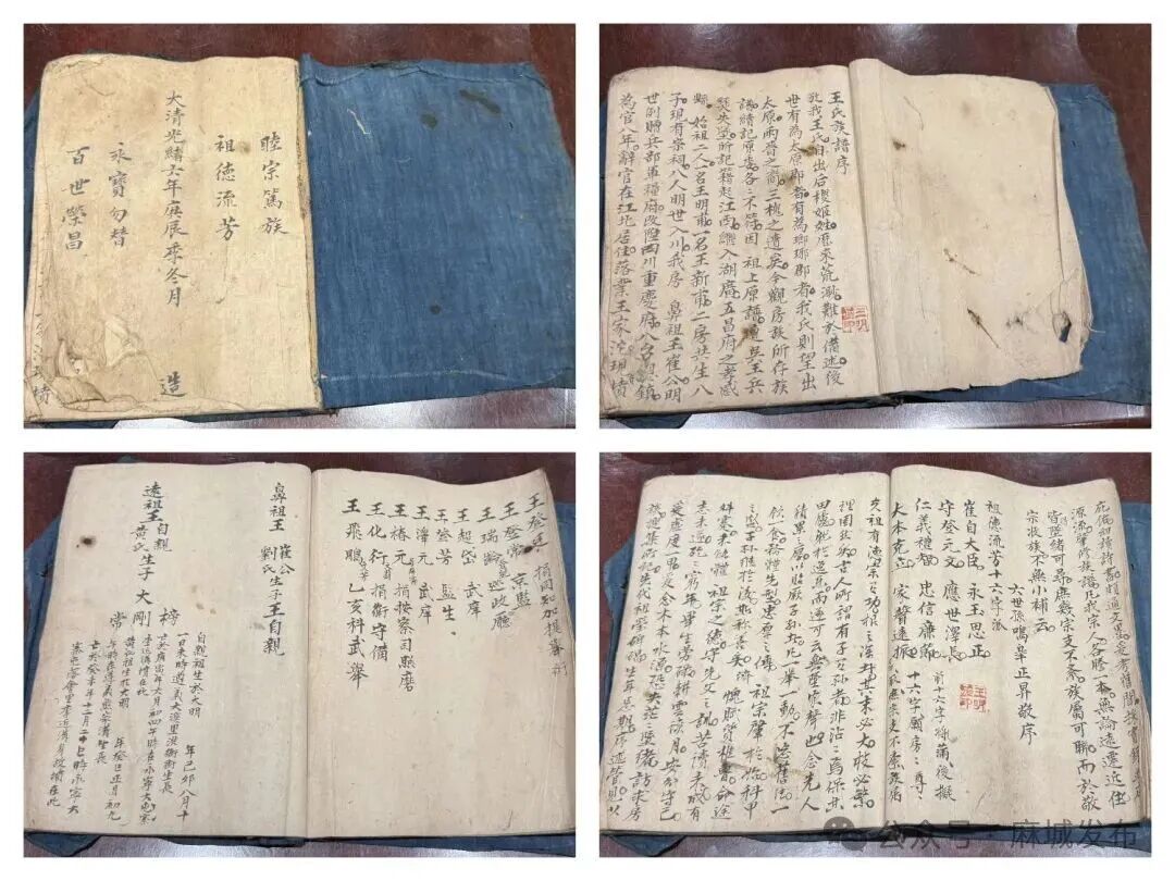 9月30日下午,麻城孝感乡文化园谱堂大厅的桌面上放着两本家谱,一本是新修的王氏家谱,还有一本用蓝布做书皮、内页手写字体刻印的泛黄老谱,两位白发老人正坐在桌前用各自的方言交流,一个用纯正的四川话,一个用正宗的麻城话,但这似乎没有影响两人的交流。