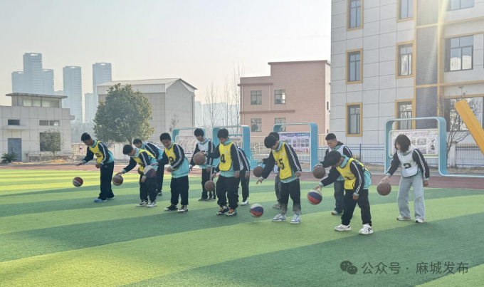 篮球操环节,学生们灵活舞动着手中的篮球,动作干净利落、整齐划一,展现出良好的纪律性和团队意识。篮球操结束后,各年级学生根据年级分流至不同运动区域,开展项目化体育活动。