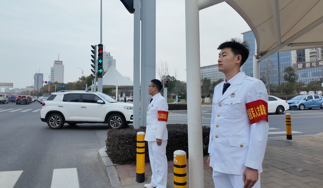 在金桥大道主要交通路口,身着统一标识服装的退役军人志愿者化身“文明护航员”,在早高峰时段协助交警维持交通秩序,耐心劝导闯红灯、逆行等不文明行为。