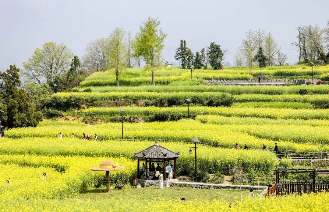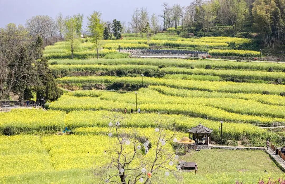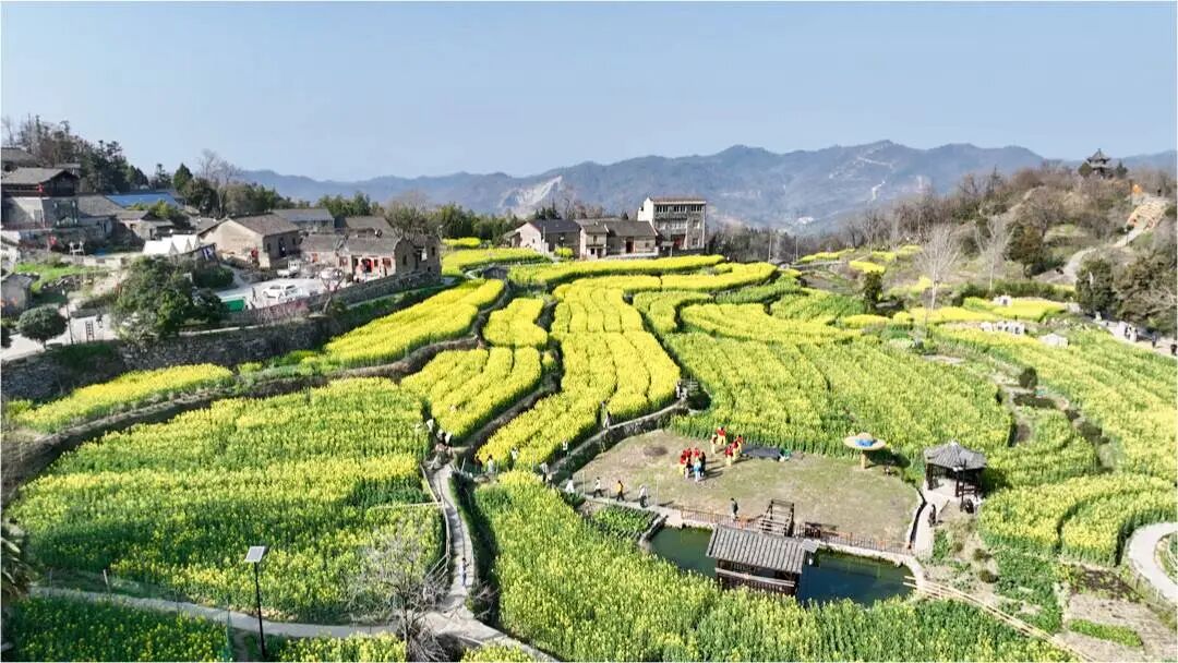 村边,梯田依山层叠,近百亩油菜花从山脚铺到半腰。不像平原花海一望无际,这里的金色层层错落,随山势起伏,每一眼都是天然的构图,更加“出片”。