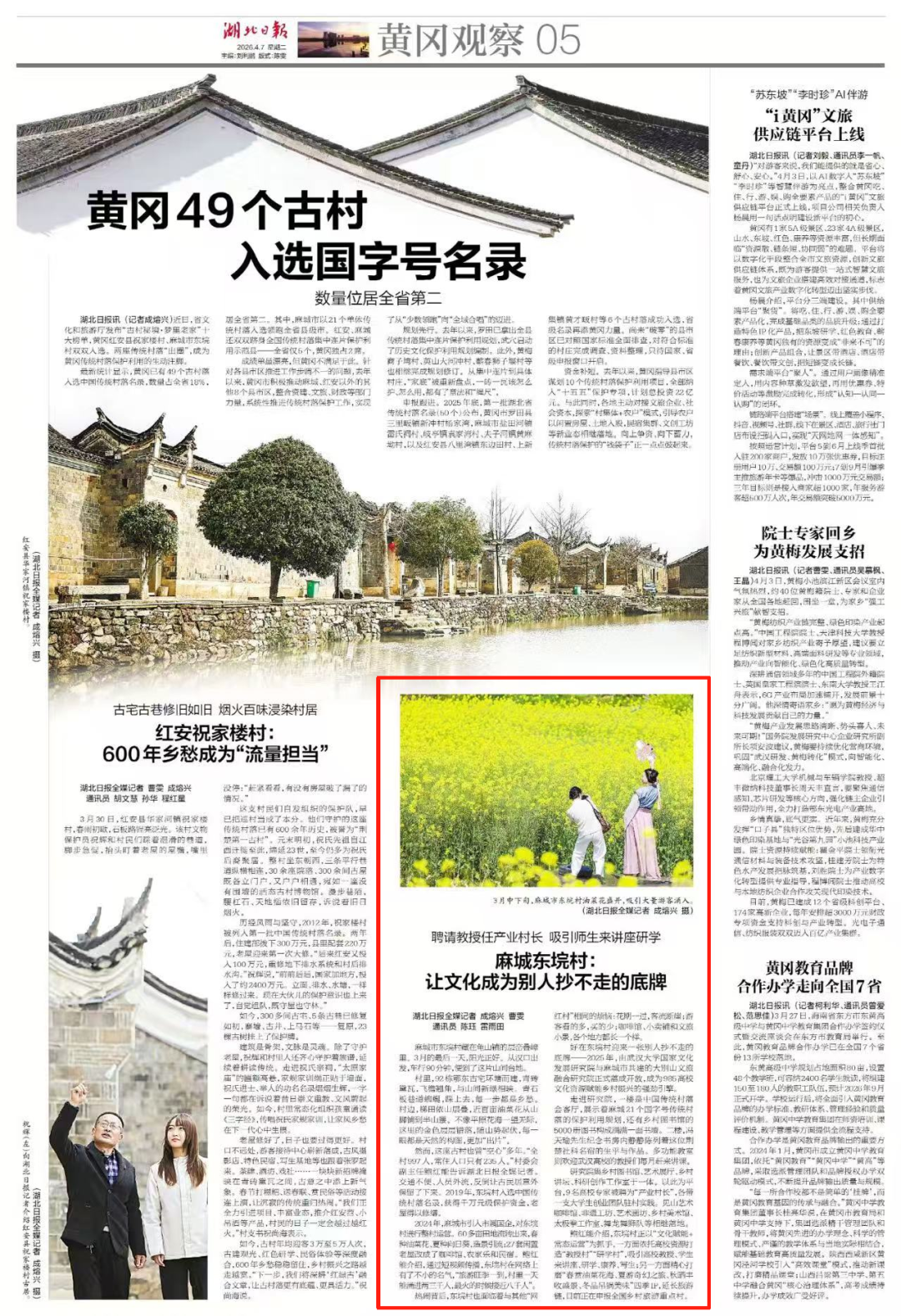 鲍红能介绍,东垸村正以“文化赋能+常态运营”为抓手,一方面依托高校资源打造“教授村”“研学村”,吸引高校教授、学生来讲座、研学、康养、写生;另一方面精心打磨“春赏油菜花海、夏游奇幻之旅、秋晒丰收盛景、冬品吊锅美味”四季IP,延长旅游链,目前正在申报全国乡村旅游重点村。”