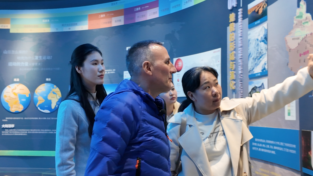 赫苏斯·格拉纳多斯·桑切斯教授认真察看来自全球各地的岩石矿物标本、地质剖面模型,并不时与陪同师生、基地工作人员深入交流。在体验馆内VR影像时,他神情专注,沉浸式感受大别山地貌从远古到如今的演化变迁,随后还围绕地质演化规律与科普教育创新路径展开详细探讨。
