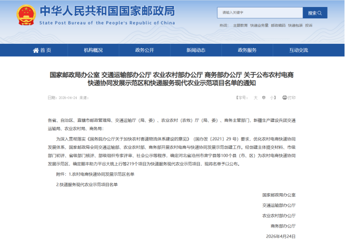 4月24日,国家邮政局办公室、交通运输部办公厅、农业农村部办公厅、商务部办公厅,联合发布《关于公布农村电商快递协同发展示范区和快递服务现代农业示范项目名单的通知》,麻城市正式被确定为“农村电商快递协同发展示范区”。